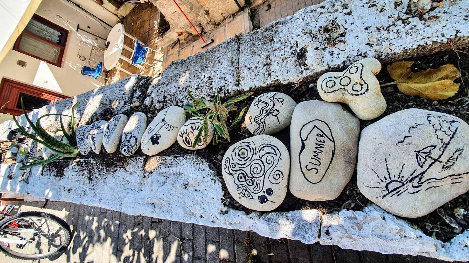 Some years back, my family and I wanted to tend a public garden outside my summer home in Crete. Near the cacti planted we added some rocks to block wild grass growing. Taking a step back, we enhanced the garden by adding simple sketches on those rocks.